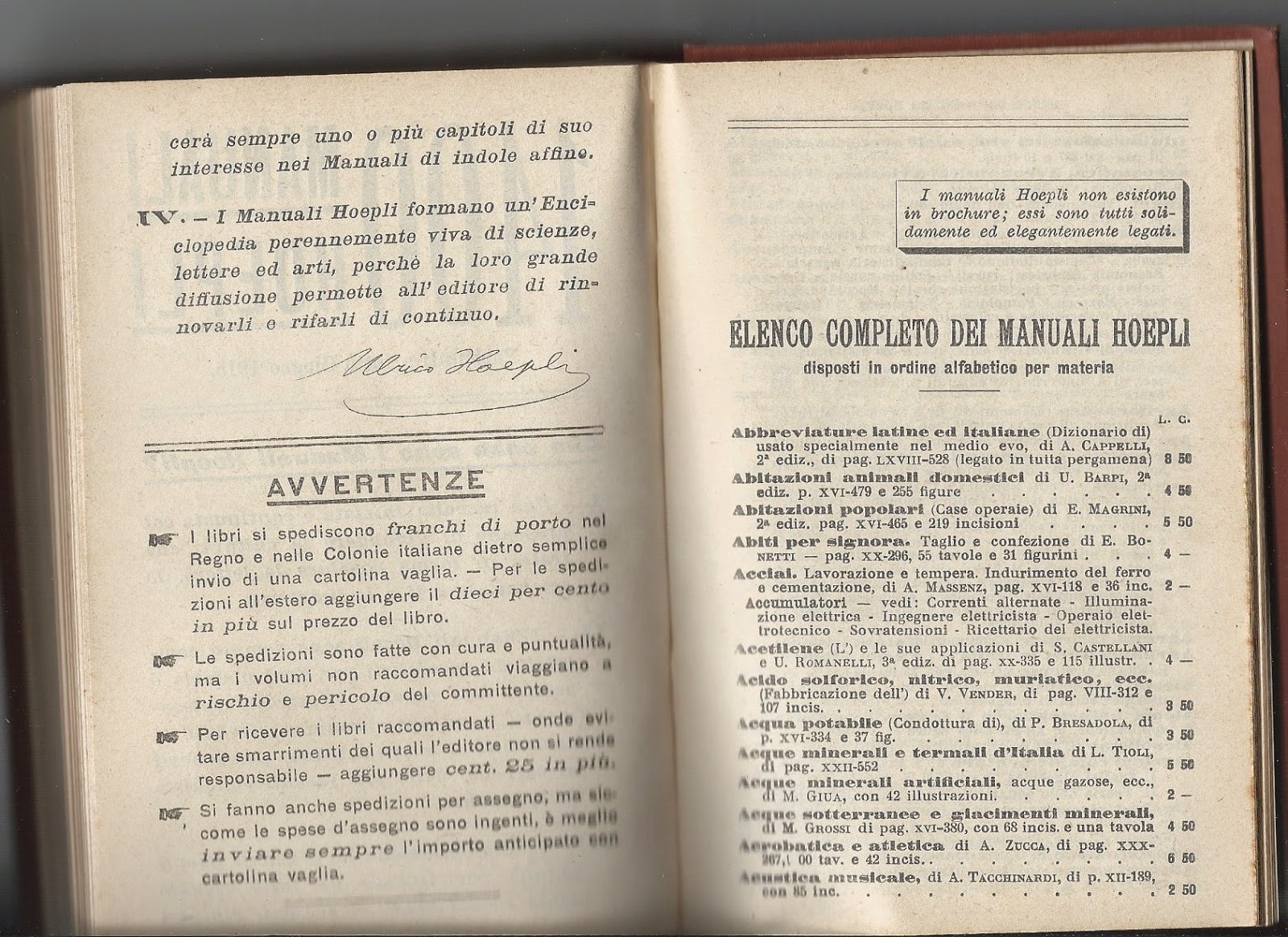 I manuali Hoepli non esistono in brocure; essi sono tutti solidamente ed elegantemente legati.